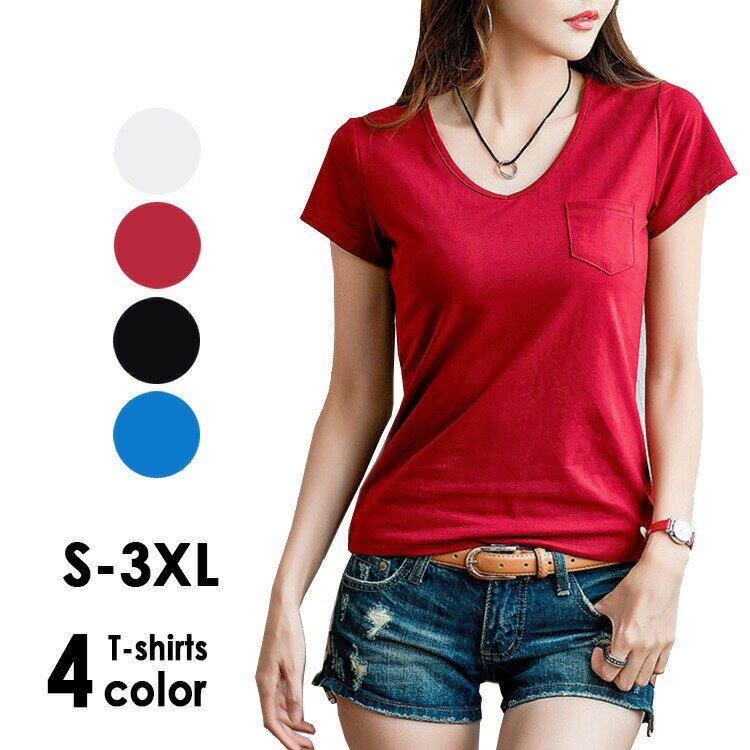tシャツ レディース 半袖 カジュアル vネック 無地 トップス 夏 綿 コットン ポケット付き 大きいサイズ おしゃれ かわいい シンプル きれいめ 重ね着 大人 ガールズ ママ 涼しい スポーツ ヨガ 20代 30代 40代 黒 白 ホワイト 赤 ブルー 送料無料