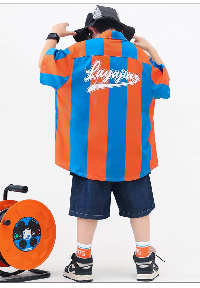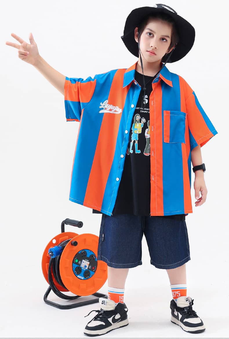 キッズダンス セット衣装 単品販売 子供ダンス 男の子 女の子 縞シャツ ストライプ デニム短パン ジーパン ゆるシャツ hiphop 可愛い 夏用 カジュアル 子供服 舞台