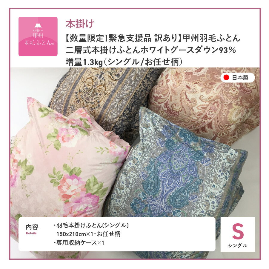 提供元:株式会社タキ・リビング 商品説明 名称 【数量限定!緊急支援品 訳あり】 甲州羽毛ふとん 二層式本掛けふとんホワイトグースダウン93%増量1.3kg(シングル/お任せ柄) 内容 羽毛本掛けふとん(シングル)×1枚 専用収納ケース×1枚 容量 ■サイズ:150x210cm(シングル) ■詰め物:ホワイトグースダウン93%フェザー7% ■詰め物重量:1.3kg ■生 地:綿100%(超長綿サテン) ■洗濯:洗濯絵表示をご確認ください ■カラー:暖色・寒色 ※柄の指定はできません。