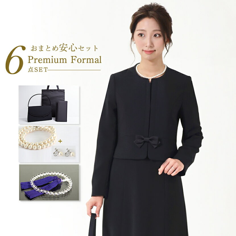プレミアムフォーマル 6点セット ブラックフォーマル ノーカラー ジャケット 前開き 七分袖 ワンピース リボン オールシーズン対応 アンサンブル フォーマルバッグ サブバッグ 袱紗 女性 念珠 パール ピアス イヤリング 高品質 喪服 黒 冠婚葬祭 送料無料 PM-2147