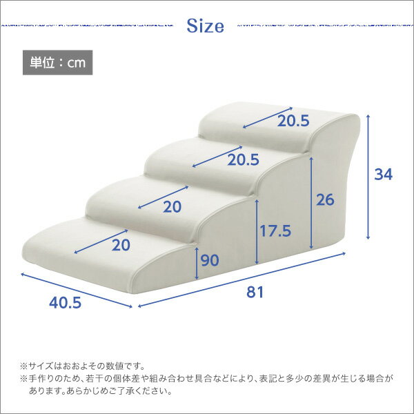 商品名日本製ドッグステップPVCレザー、犬用階段4段タイプ サイズ(約)幅40.5x奥行81x高さ34cm 【商品重量】約3.6kg 材質「ドッグステップ」4段 クッション材:ウレタン 生地:合成皮革(ポリエステル100%) 備考【梱包サイズ】(約)40x33x82cm 完成品でお届けします。