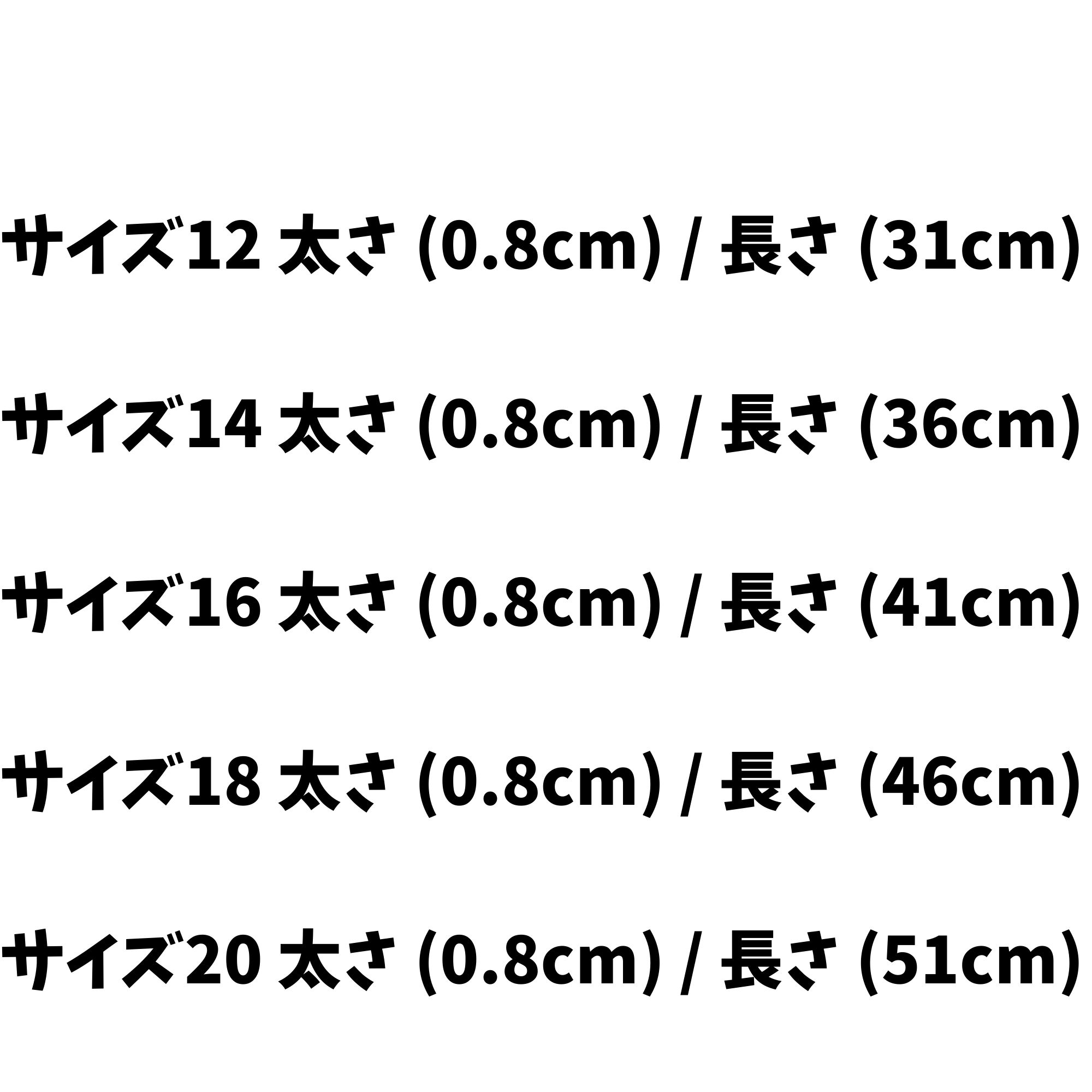 商品情報サイズサイズ12 (太さ (0.8cm) / 長さ (31cm))サイズ14 (太さ (0.8cm) / 長さ (36cm))サイズ16 (太さ (0.8cm) / 長さ (41cm))サイズ18 (太さ (0.8cm) / 長さ (46cm))サイズ20 (太さ (0.8cm) / 長さ (51cm))※ワンちゃんの首の太さプラス5-8cmがちょうどいいサイズです。