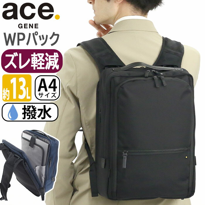 ビジネス リュック メンズ ace.GENE エース ジーン 正規品 WPパック 負荷軽減タイプ ビジネスバッグ バッグ ビジネスリュック 2気室 13.3インチ PC対応 PC収納 A4 通勤 通勤用 軽量 かばん 仕事 出張 洗える背面パッド 撥水 バーテクトポケット ブラック 13L 67192