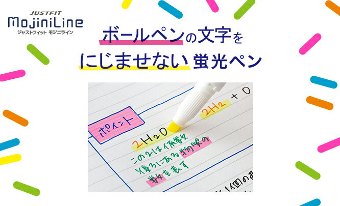 こんな蛍光ペンが欲しかった! ! と言い切れるゼブラの蛍光ペン「ジャストフィットモジニライン」が新登場! !特徴として、文字にライン(モジニライン)を引いても、にじませない! だから、ボールペンの上からベタ塗りできる! 線をなぞって縁取りもキレイ!ペン先は、定番商品のジャストフィットと同じ仕様で、ペン先がしなってキレイに引ける。