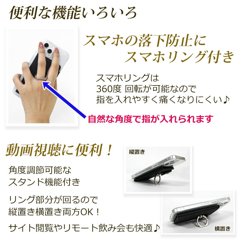 カード入れに自由自在に角度が変えられるスマホスタンドと落下防止のデコスマホリングが合体した便利グッズです。