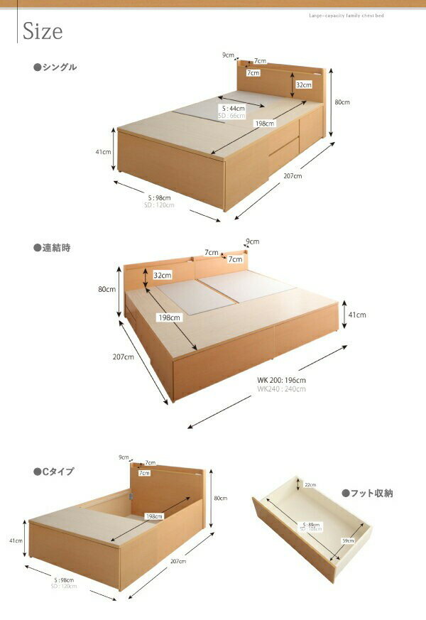 商品名連結ベッド 幅200 キング ワイド 2人 3人 4人 家族 つなげる 2台 連結 分割 ファミリー 親子 マットレス付き チェストベッド ミドル ベッド下収納 引き出し付き 大容量 宮付き ヘッドボード 枕元 棚 ラック 携帯置き ティッシュ置き メガネ置き リモコン 頭上 収納 携帯 ゲーム スマホ 充電 電気 コンセント 北欧 おしゃれ モダン アンティーク商品バリエーション組立付 薄型標準ポケットコイルマットレス付き C+C 幅210全バリエーション商品説明●ベッドフレームWK200:シングルベッド×2WK240:セミダブルベッド×2WK200:幅196×長さ207cm×高さ80cmWK240:幅240×長さ207×高さ80cm【収納部サイズ】Aタイプ:浅型引き出し/55×38×12cm、深型引き出し/55×38×26cm、フット引き出しS:89×59×22cm、SD:108×59×22cmBタイプ:浅型引き出し/57×38×12cm、深型引き出し/57×38×26cmCタイプ:フット引き出しS:89×59×22cm、SD:108×59×22cm【材質】本体:MDFプリント、引出し:桐集成材【生産国】フレーム:日本【カラー】//【梱包サイズ】Aタイプシングル:100×11×82cm、100×70×43cm、47×7×130cm、133×6×43cm、68×50×43cm、68×50×43cmセミダブル:123×11×83cm、123×70×43cm、69×7×130cm、133×6×43cm、68×50×43cm、68×50×43cmBタイプシングル:100×11×83cm、47×100×9cm、198×6×43cm、100×43×6cm、68×50×43cm、68×50×43cm、68×50×43cmセミダブル:123×11×83cm、69×100×9cm、196×6×43cm、123×43×6cm、68×50×43cm、68×50×43cm、68×50×43cmCタイプシングル:100×11×83cm、100×70×5cm、47×7×130cm、133×12×43cmセミダブル:123×11×83cm、123×70×43cm、69×7×130cm、133×12×43cm※各サイズ、重量は概算になります。