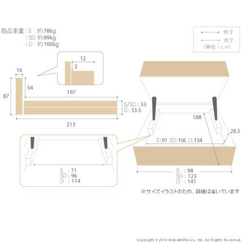 ●安心のメーカー2年保証【バリエーション】ダークブラウン・ミディアムブラウン・ナチュラル【仕様】本体:プリント紙化粧合板床板:プリント紙化粧合板跳ね上げ収納:ガススプリングコンセント:1口1500Wコード長さ:約1.7m照明:LED0.2W◎組立品【サイズ】外寸:幅123x奥行213x高さ87cm重量:約89kg床面高さ:33cm床面サイズ:幅123x奥行197cm床面から宮上まで高さ:54cm宮奥行:16cm宮上有効サイズ:幅122.5x奥行12cm宮立ち上がり高さ(奥):2cm跳ね上げ収納サイズ:幅116/96x奥行188x高さ28.5cm