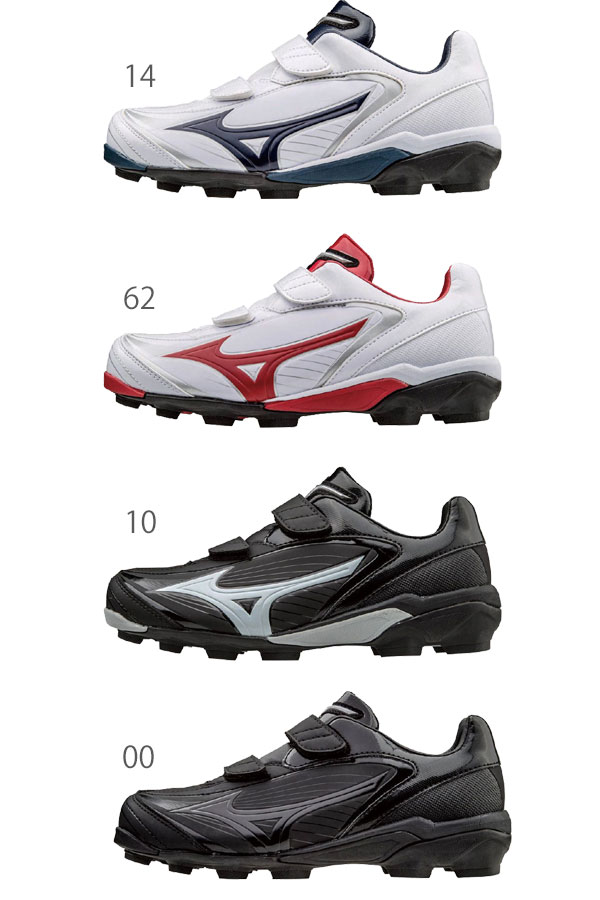 ネームや好きな文字が入ります 一歩目から差をつけろ! ■メーカー:ミズノ ■品番:11gp1721 ■カラー:ブラック×ブラック(00)・ブラック×ホワイト(10)・ホワイト×ネイビー(14)・ホワイト×レッド(62) ■サイズ:18.0、19.0、20.0、21.0〜23.0cm ■素材:甲材/人工皮革、底材/ゴム底 ■質量:約210g(21.0cm片方) ■スパイク:ゴム ■3E相当