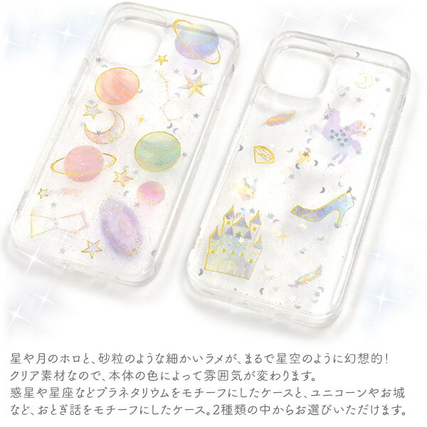 iPhone 12 mini用 散りばめたラメが幻想的!プラネタリウムソフトクリアケース 星や月のホロと、砂粒のような細かいラメが、まるで星空のように幻想的! 惑星や星座などプラネタリウムをモチーフにしたケースと、 ユニコーンやお城など、おとぎ話をモチーフにしたケース。