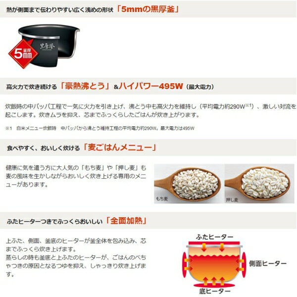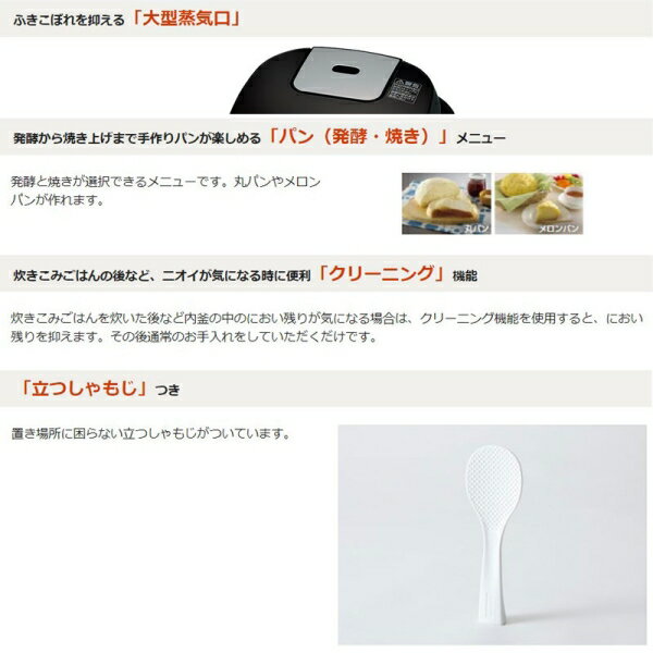 商品特徴一覧【生活家電・キッチン小物 → 象印マホービン → 炊飯ジャー → マイコンタイプ】、NLBV05-BA、象印マホービン(株)、17-9342、4974305219503、通信販売、通販、販売、買う、購入、お店、売っている、ショッピング【象印 マイコン炊飯ジャー『極め炊き』(3合炊き/ブラック) (NLBV05-BA)】広告文責(有)イースクエアTEL:0120-532-772・商品名: 象印 マイコン炊飯ジャー『極め炊き』(3合炊き/ブラック)・型番: NLBV05-BA・JANコード: 4974305219503・販売元: 象印マホービン(株)【特徴】● 熱が側面まで伝わりやすい広く浅めの形状「5mmの黒厚釜」● 高火力で炊き続ける「豪熱沸とう」&ハイパワー495W(最大電力)● いろいろなご飯が炊ける専用のメニューがあります● ふたヒーターつきでふっくらおいしい「全面加熱」● ふきこぼれを抑える「大型蒸気口」● 本体カラーはブラック【仕様】■ 炊飯容量(白米):0.09〜0.54L(0.5〜3合)■ 最大炊飯容量:0.54L以上0.99L未満■ 電源:交流 100V 50/60Hz■ 消費電力:495W■ 1回あたりの炊飯時消費電力量:97.6Wh ※1■ 一時間あたりの保温時消費電力量:9.23Wh ※1■ 省エネ基準達成率:102%(エコ炊飯)■ 年間消費電力量:38.2kWh/年(エコ炊飯)■ 炊飯方式:電磁誘導加熱方式(IH)以外■ 外形寸法:(約)幅23.5×奥行32.5×高さ19.5cm(ふた開き時の高さ約36.5cm)■ 質量:約3.1kg■ 付属:立つしゃもじ、計量カップ2種(白米用、無洗米専用)、取扱説明書※1 消費電力量は、炊飯量、ご使用メニュー等によって異なります。