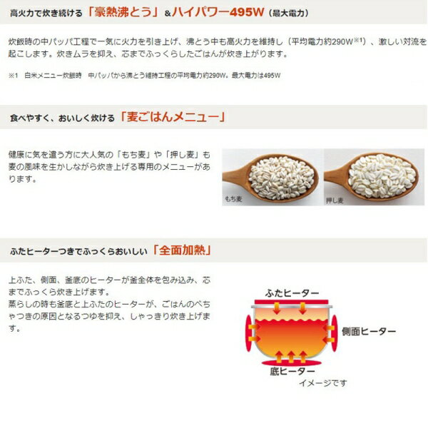 商品特徴一覧【生活家電・キッチン小物 → 象印マホービン → 炊飯ジャー → マイコンタイプ】、NLBD05-WA、象印マホービン(株)、17-9344、4974305219527、通信販売、通販、販売、買う、購入、お店、売っている、ショッピング【象印 マイコン炊飯ジャー『極め炊き』(3合炊き/ホワイト) (NLBD05-WA)】広告文責(有)イースクエアTEL:0120-532-772・商品名: 象印 マイコン炊飯ジャー『極め炊き』(3合炊き/ホワイト)・型番: NLBD05-WA・JANコード: 4974305219527・販売元: 象印マホービン(株)【特徴】● 高火力で炊き続ける「豪熱沸とう」&ハイパワー495W(最大電力)● いろいろなご飯が炊ける専用のメニューがあります● ふたヒーターつきでふっくらおいしい「全面加熱」● 熱が側面まで伝わりやすい広く浅めの形状「黒厚釜(2.5mm)」● ふきこぼれを抑える「大型蒸気口」● 本体カラーはホワイト【仕様】■ 炊飯容量(白米):0.09〜0.54L(0.5〜3合)■ 最大炊飯容量:0.54L以上0.99L未満■ 電源:交流 100V 50/60Hz■ 消費電力:495W■ 1回あたりの炊飯時消費電力量:93.7Wh ※1■ 一時間あたりの保温時消費電力量:9.37Wh ※1■ 省エネ基準達成率:102%(エコ炊飯)■ 年間消費電力量:37.2kWh/年(エコ炊飯)■ 炊飯方式:電磁誘導加熱方式(IH)以外■ 外形寸法:(約)幅23.5×奥行32.5×高さ19.5cm(ふた開き時の高さ約36.5cm)■ 質量:約2.7kg■ 付属:立つしゃもじ、計量カップ2種(白米用、無洗米専用)、取扱説明書※1 消費電力量は、炊飯量、ご使用メニュー等によって異なります。
