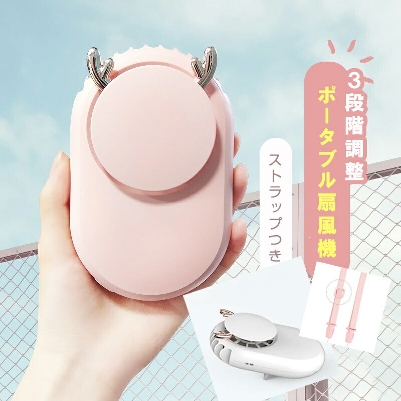 両手を塞がない ツノがかわいい ポータブルファン ストラップつき 充電式 ポータブルファン ハンディ 扇風機 卓上 2way コンパクト ファンシー ミニ扇風機 ネックストラップ ハンズフリー ミニ 携帯 手持ち シンプル