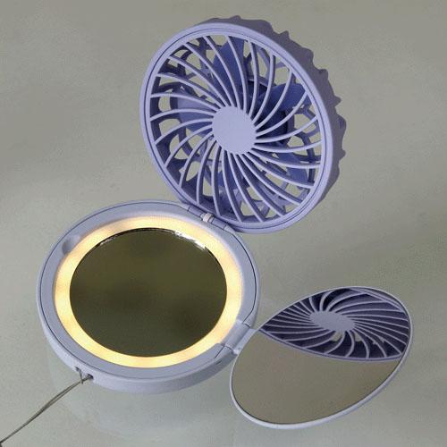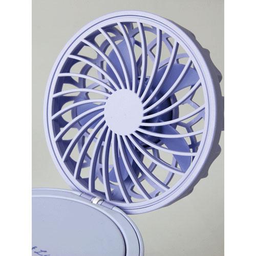 LED付のコンパクトミラーと一体型になった、フェミニンな小型扇風機です。